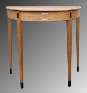 The demilune table contains echoes in the shapes of the inlay, echoes between the leg bottoms and the dark inserts and others. There is a “family resemblance” in the various parts that give the piece a sense of unity.