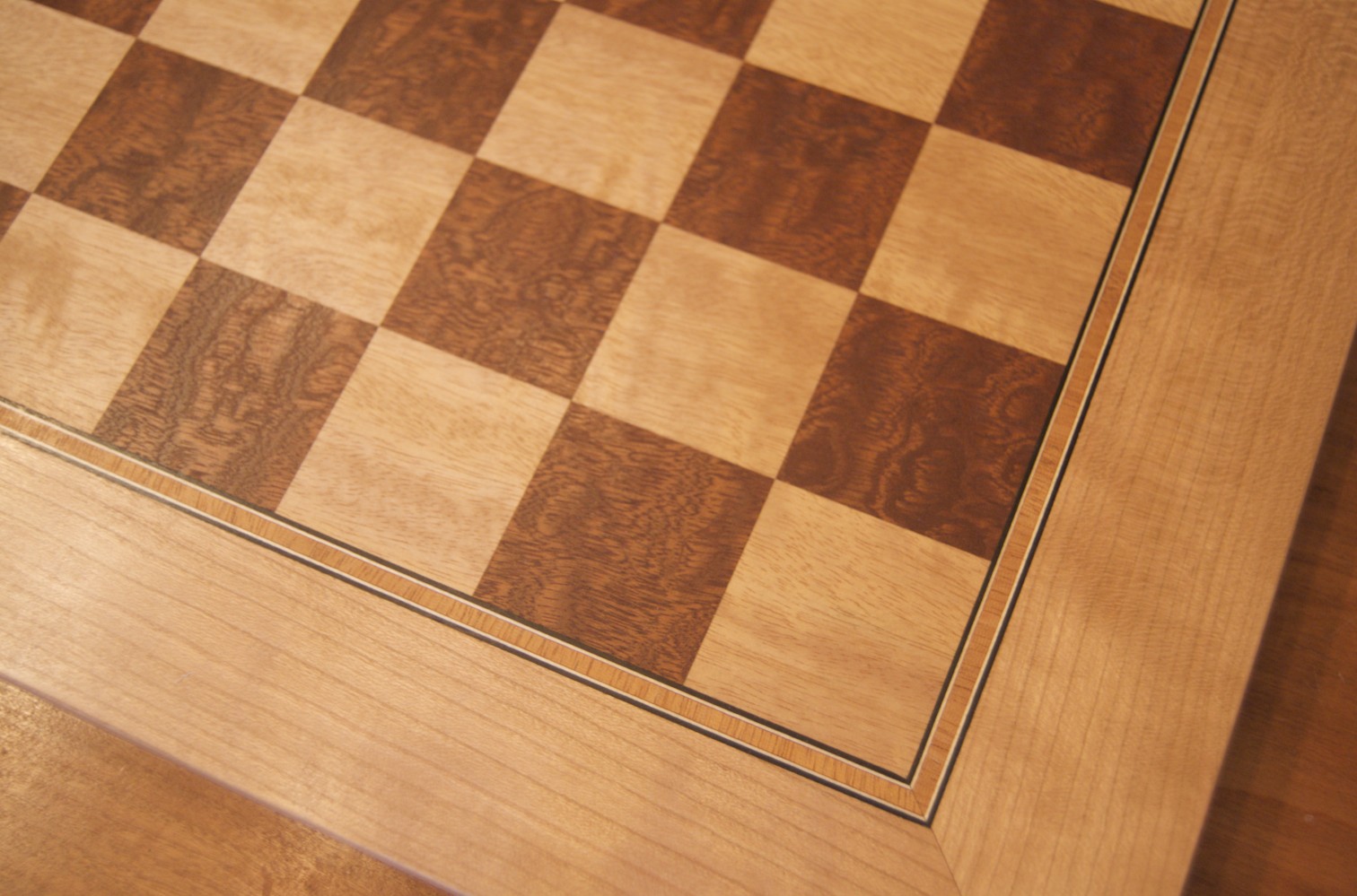 The chessboard shown above gets some of its life from the contrast between the squares in the playing field. If the large border (outside the small strip of inlay) were darker, the board might gain additional life.