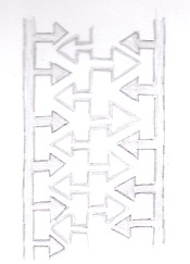 Although not incorporated into a piece of furniture, the sketch to the left exhibits both deep interlock (which part locks to which, or do they all lock together?), and ambiguity (can you tell which part belongs to which?) Can you find the slightly stylized letter “A”? (I count at least 7 of them imbedded in the pattern.) The pattern also has strong alternating repetition, echoes, positive space (is there any part that is “left over”?) and strong local symmetries. Variations on this pattern are often found in antique oriental rugs. I have yet to figure out how to create this pattern in a piece of furniture! Perhaps by using inlay?
