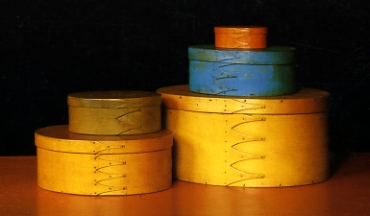 Shaker oval boxes painted with beautiful, pure, and sometimes very intense colors. The colors reinforce the good shape – take away the color, and these boxes become much more commonplace (which is one reason that shellac, oil, and varnish finishes on these boxes usually diminish rather than enhance them.)