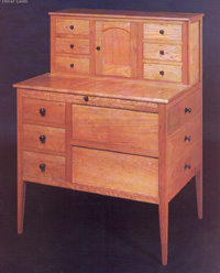 The often reproduced classic Shaker sewing desk is, like many Shaker pieces, strongly asymmetrical as a whole. Some of the drawers are even placed on the side rather than on the front bringing a very strong sense of asymmetry! But the larger asymmetry is supported by many strong local symmetries in the front panels and the drawers (which interestingly, for a Shaker piece, are not graduated, so strong is the need for the local symmetry.) I cannot credit this photo to a specific craftsman since it is like one of many that I have seen or photographed.
