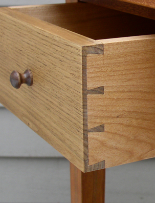 Alternating repetition is best demonstrated by example. Assume for a moment that the characters “x”, “<” and “>” represent three strong centers. Simple simple repetition of a single center like “xxxx” (think dentil molding) creates some interest, but not much. Simple repetition using two centers “x>x>x>x” (think egg and dart) may be somewhat better, but alternating repetition ” ” has the potential to create much more significant interest (even with these simple characters.) Evenly spaced finger joints or evenly spaced pins and tails along a dovetailed edge “x x x x x” may be structurally sound, but it is the repetition of small pins and wider tails “x x x x x” that begins to bring life to the sequence. The small components in good furniture often come to life when they are arranged to create alternating repetition.